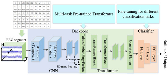 Inspired by the work of 12-in-1, the motivation of this study is to implement a deep learning method trained on several open-source EEG datasets to alleviate the impact of limited data size on model performance. Furthermore, it must consider the fact that the model performance may be impacted by the challenge of data distribution shift when trained on multiple datasets. Contrastive learning provides a feasible approach to addressing the challenge of data distribution shift. For example, some studies focus on designing DL models to deal with issues including inter-subject variability and limited data size of EEG signals. Those issues challenge the performance of DL models for specific tasks. For instance, Shen et al. proposed a Contrastive Learning method for Inter-Subject Alignment (CLISA) to tackle the cross-subject emotion recognition problem [19]. Kostas et al. use a self-supervised training objective to learn compressed representations of raw data signals for brain–computer interface (BCI) classification and adopts a single pre-trained model to model completely novel raw EEG sequences recorded with differing hardware and different subjects performing different tasks [20]. In this context, we propose a novel multitask pre-trained transformer model that integrates CNN and transformer architectures, aiming to enhance the efficiency and accuracy of DOC state classification.