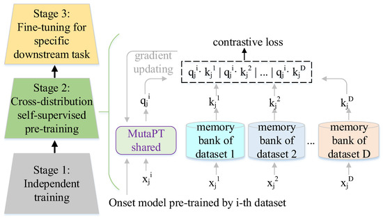 The D MUTAPT models trained in the phase of independent supervised training can be regarded as D feature extractors, and we use Fi(·) () to represent the i-th feature extractor. It is worth noting that the classifier part is removed from the MutaPT model. D memory banks, i.e., , are initialized from the D datasets with the corresponding feature extractor . represents the sample number of the i-th dataset used for training the model. In each iteration, we use to represent the j-th EEG segment belonging to the i-th dataset in batch B. The backbone of the MutaPT model trained by the i-th dataset is selected as an onset model representing a pre-trained model for the target downstream task. We obtain query feature vectors by feeding into the onset model. It is noteworthy that the length of the query vector and the key vector is 256, as the last fully connected layer of the MutaPT backbone outputs 256 units. Given the query vectors, we first measure cross-distribution pairwise similarities between the query vector and the vectors stored in the -th memory bank. The formula of the cross-distribution pairwise similarities is listed as follows:
