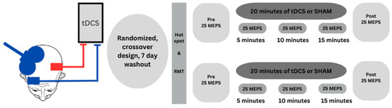 This study employed a double-blind, SHAM-controlled, randomized, within-subject experimental design. The within-subject design was chosen to mitigate the substantial inter-individual differences in the responsiveness to tDCS that are thought to be due to a combination of a wide range of anatomic, biological, physiological, and genetic factors [42,43]. In addition, within-subject designs allow for more statistical power compared with between-subject designs [44]. The order of presentation of the tDCS and SHAM conditions was assigned to participants using an online application (Research Randomizer; www.randomizer.org) by a member of the research team who did not participate in the collection of data [45,46]. All participants underwent two experimental sessions that were conducted at the same time of day and spaced 7 days apart [47,48], which is the most common washout period used in tDCS studies. Both sessions were identical except for the type of stimulation applied (tDCS, SHAM).