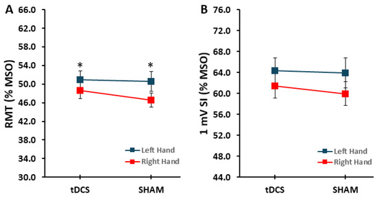 RMT and 1 mV SI. (A) RMT for the left and right hands in the tDCS and SHAM conditions. * indicates that the RMT was greater for the left hand compared with the right hand (p = 0.049); (B) 1 mV SI for the left and right hands in the tDCS and SHAM conditions.