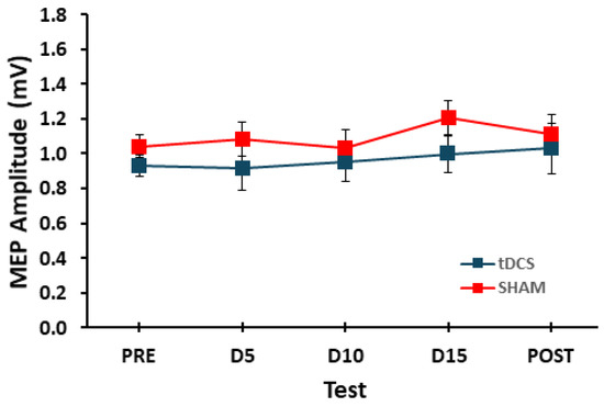 MEP amplitude for the tDCS and SHAM conditions in the Pre, D5, D10, D15, and Post TMS test blocks. Each data point represents the average of 25 MEPs recorded in each TMS test block.