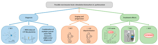 Possible non-invasive brain stimulation biomarkers in Parkinsonism. Illustration of the possible neurophysiological biomarkers for diagnosis, staging, and progression, and therapeutic applications in Parkinsonism. SICI: short-interval intracortical inhibition, NIBS: non-invasive brain stimulation, TMS: transcranial magnetic stimulation, SICF: short-interval intracortical facilitation, LTP: long-term potentiation, I-O curve: input–output curve.