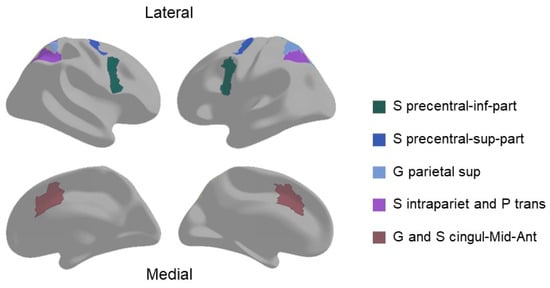 The full details of the ABCD scanning protocol and image processing pipelines have been previously described in detail [29,38]. In brief, task-based functional images were collected on 3T scanners (Siemens Prisma, General Electric 750 and Philips) with a multiband gradient echo-planar imaging sequence. Task-fMRI-specific preprocessing included the removal of initial volumes (8 TRs for Siemens and Philips, 5 TRs for GE DV25, and 16 TRs for GE DV26), and normalization and demeaning of voxel data. Task-related activation strength was estimated using a general linear model (GLM) in AFNI’s 3dDeconvolve with nuisance regressors for baseline, quadratic trend, and motion. The hemodynamic response function was modeled using gamma functions with temporal derivatives through AFNI’s SPMG model. GLM coefficients and t-statistics were subsequently sampled onto the cortical surface, projecting 1 mm into the cortical gray matter along surface normal vector. For the EN-back task, predictors were established for each type of stimulus across different n-back conditions and fixation. Linear contrasts were computed for various comparisons, such as 2-back versus 0-back across stimulus types (to measure the responses to working memory load), and emotional faces versus neutral faces across memory loads (to measure the responses to emotional stimuli). Regions of interest (ROIs) involving cortical areas were delineated according to the Destrieux atlas. Based on previous research, we selected the ROIs most likely recruited by working memory challenge in n-back task [29,39,40]: inferior part of the precentral sulcus (S precentral-inf-part), superior part of the precentral sulcus (S precentral-sup-part), middle-anterior part of the cingulate gyrus and sulcus (G and S cingul-Mid-Ant), intraparietal sulcus and transverse parietal sulci (S intrapariet and P trans), and superior parietal lobule (G parietal sup) (Figure 1). The averaged beta weights across two runs for each of these ROIs were used in follow-up analyses.