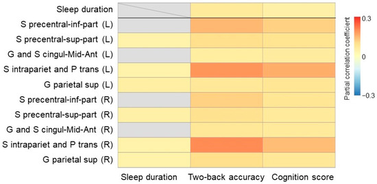 The pairwise associations between sleep duration, 2-back accuracy, cognition score, and the activation of ROIs for the 2-back versus 0-back contrast. The gray grid indicates a nonsignificant correlation (p > 0.05 FDR corrected). Abbreviations: left (L); right (R).