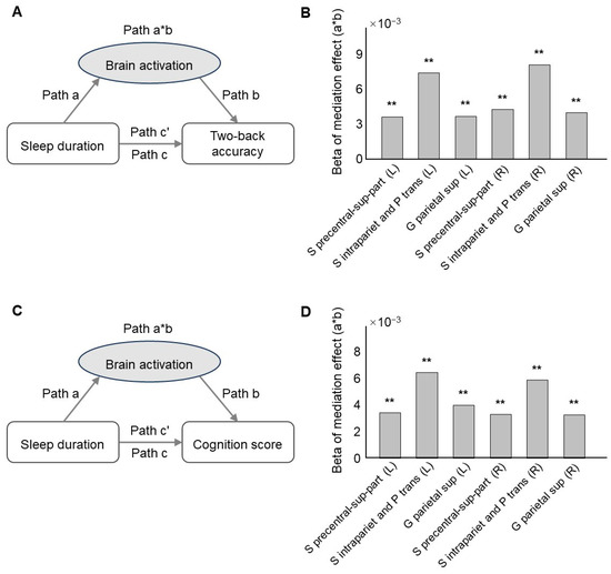 To explore whether the activation of ROIs acted as a mediator between sleep duration and behavioral measures, the six ROIs for which the activation showed significant correlations with both sleep duration and behavioral measures were examined in the mediation model. All of them were found to significantly mediate the effect of sleep duration on 2-back accuracy (S precentral-sup-part, left, p = 0.007, β = 3.65 × 10−3; right, p = 0.001, β = 4.27 × 10−3; S intrapariet and P trans, left, p = 0.006, β = 7.39 × 10−3; right, p = 0.006, β = 8.12 × 10−3; G parietal sup, left, p = 0.001, β = 3.69 × 10−3; right, p = 0.006, β = 4.02 × 10−3, FDR corrected (Figure 3A,B, Table S5)), as well as the effect of sleep duration on cognition score (S precentral-sup-part, left, p = 0.007, β = 3.42 × 10−3; right, p = 0.001, β = 3.30 × 10−3; S intrapariet and P trans, left, p = 0.006, β = 6.44 × 10−3; right, p = 0.004, β = 5.89 × 10−3; G parietal sup, left, p = 0.001, β = 3.98 × 10−3; right, p = 0.004, β = 3.28 × 10−3, FDR corrected (Figure 3C,D, Table S6)).