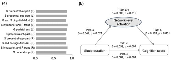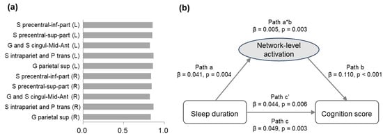 To examine the mediation effect of task-related frontoparietal activation at the network level, factor analysis was conducted on the activation of the 10 ROIs for the 2-back versus 0-back contrast. From the PCA, we extracted one component (see Figure 4a for component loadings), which accounted for 71.64% of the total variance. This component significantly mediated the association between sleep duration and cognition score (p = 0.003, β = 4.53 × 10−3 (Figure 4b)).