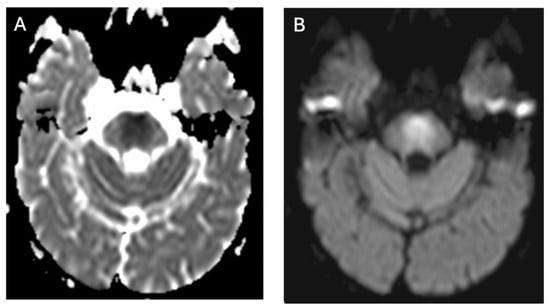 In WD, diffusion abnormalities can manifest as both restricted and increased diffusion (Figure 5). Diffusion restriction is relatively uncommon and typically appears in the early stages of the disease, presenting as hyperintense foci on T2-weighted and FLAIR images, indicative of edematous changes [32,33,34,35,36,37]. Increased diffusion, observed in structures such as the putamen, globus pallidus, internal capsules, midbrain, pons, and white matter, likely reflects neuronal loss, gliosis, and spongiosis [36].