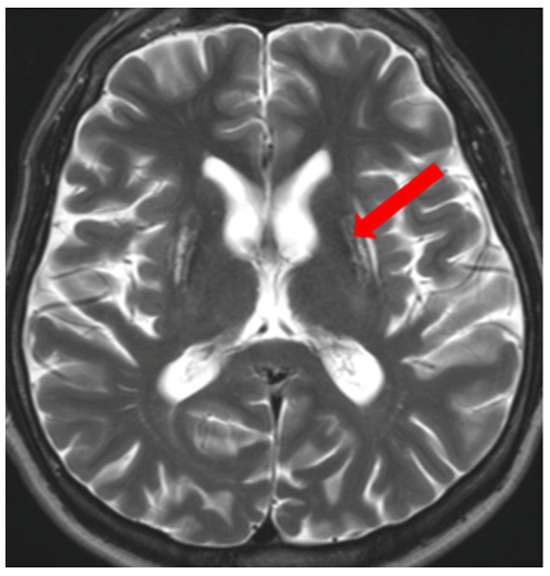 In cases of advanced disease (long-term and untreated), brain MRI changes may appear as hypointense areas on T1-weighted images (necrosis or atrophic changes) [12,13,14,15,16,17,18,19,20,21] (Figure 3). It should be noted that several metabolic, genetic, neoplastic, and inflammatory disorders can involve the basal ganglia symmetrically. Occasionally, these disorders also affect other brain structures, sometimes unilaterally. Brain MRI plays a supportive role in diagnosis and aids in differential diagnosis; however, without clinical symptoms and additional clinical, metabolic, genetic, etc., examinations, brain MRI alone cannot form the basis for disease diagnosis [1,2,3].