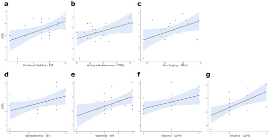 Correlation analyses computed between ECPi, CCPi and scale scores from GDMS, MS, BFI, and FFMQ highlighted significant positive correlations between the ECPi and the BFI EmotionalStability score (r = 0.524, p = 0.018, Figure 1a), and the FFMQ ActWithAwareness (r = 0.458, p = 0.042, Figure 1b) and NonJudging (r = 0.467, p = 0.038, Figure 1c) scores. Again, analyses highlighted significant positive correlations between the CCPi and the BFI Agreeableness (r = 0.450, p = 0.046, Figure 1d) and Openness (r = 0.522, p = 0.018, Figure 1e) scores, and the GDMS Rationale (r = 0.447, p = 0.048, Figure 1f) and Intuitive (r = 0.603, p = 0.005, Figure 1g) scores. No other correlation coefficient was found to reach the statistical threshold.
