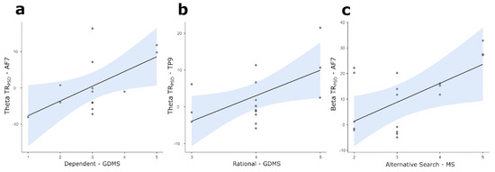 Correlation analyses highlighted positive significant correlations between the GDMS Dependent score and theta TRPSD in AF7 (r = 0.574, p = 0.032, Figure 2a) and the GDMS Rational score and theta TRPSD in TP9 (r = 0.554, p = 0.032, Figure 2b). Again, analyses highlighted a positive significant correlation between the MS AlternativeSearch score and beta TRPSD in AF7 (r = 0.623, p = 0.030, Figure 2c).