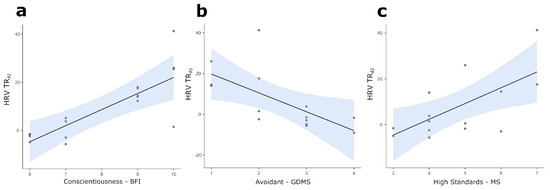 Furthermore, analyses highlighted significant positive correlations between the BFI Conscientiousness score and HRV TRAI (r = 0.787, p = 0.001, Figure 3a). Again, analyses highlighted a significant negative correlation between the GDMS Avoidant score and HRV TRAI (r = −0.617, p = 0.025, Figure 3b) and a significant positive correlation between the MS HighStandards score and HRV TRAI (r = 0.661, p = 0.014, Figure 3c).
