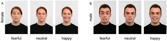 We selected portraits of 38 (19 female and 19 male) different actors from the Radboud Faces Database (RaFD; Langner et al. [83]; see Figure 1 for sample faces; as the RaFD contains an unequal number of male (20) and female (19) Caucasian faces, we did not include the following male face: #Rafd090_21). The female and male actors did not differ regarding their attractiveness ratings reported in the RaFD, Welch’s t(35.74) = 1.50, p = 0.143. For each actor, we included frontal views of three facial emotional expressions (happiness, fear, neutral). This yielded a total of 114 different faces to be displayed as close-up color images (477 × 717 pixel). To investigate the potential arousal and valence differences between the three emotional expressions and the face gender, the mean ratings were obtained from the RaFD and each subjected to a two-way ANOVA.