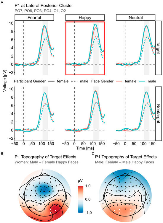 P1 component. (A) Averaged ERPs for participant gender and face gender are shown separated by status and expression. The red rectangle highlights the source of the largest interaction effect, which is the significant two-way interaction between gender and face gender for the happy target faces. (B,C) Difference topography maps for the significant pairwise comparisons of the two-way interaction.