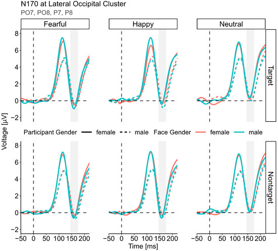 - Rostami, H.N.; Hildebrandt, A.; Sommer, W. Sex-specific relationships between face memory and the N170 component in event-related potentials. Soc. Cogn. Affect. Neurosci. 2020, 15, 587–597. [Google Scholar] [CrossRef]