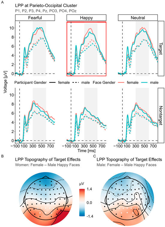 LPP component. (A) Averaged ERPs for participant gender and face gender are shown separated by status and expression. The red rectangle highlights the source of the largest interaction effect, which is the significant two-way interaction between expression and face gender for the target faces. (B,C) Difference topography maps for the significant pairwise comparisons between female and male happy target faces.