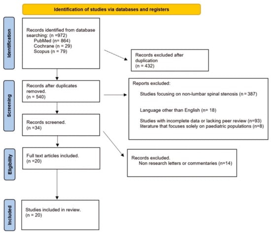 A total of 972 articles were identified and all abstracts were reviewed, according to PRISMA guidelines (Figure 1). Following the removal of duplicates, 540 articles remained. After screening titles and abstracts, articles were excluded as they did not meet the inclusion criteria and 34 full-text articles were assessed for eligibility. Subsequently, a full-text review of 20 articles was performed and finally 20 articles were included [,,,,,,,,,,,,,,,,,,,]. Table 1, Table 2 and Table 3 show all the details.