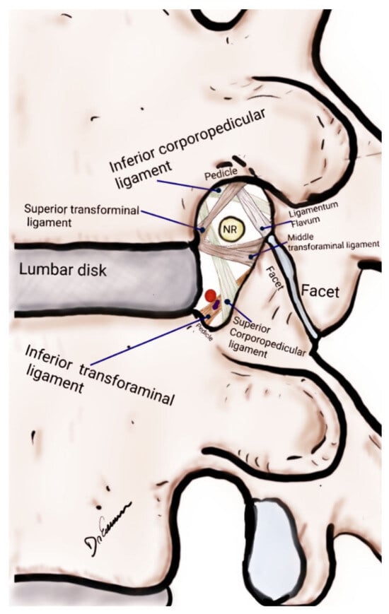 The diagnostic process for LFS usually begins with a thorough clinical evaluation, including a detailed history and physical examination. Symptoms such as radicular pain, numbness and muscle weakness are typical indicators of nerve root compression due to foraminal narrowing. However, these symptoms can overlap with other spinal pathologies, making clinical evaluation alone insufficient for a definitive diagnosis [,]. Kaneko et al. [] and Lorenc et al. [] highlighted the significance of MRI as the most sensitive imaging modality for diagnosing LFS. It provides detailed images of both bone and soft tissues, including nerves, muscles, ligaments and intervertebral discs. The role of disc, neuronal foramen, facet joints and ligaments and their relationship with the nerve root can be better understood by looking at Figure 3.