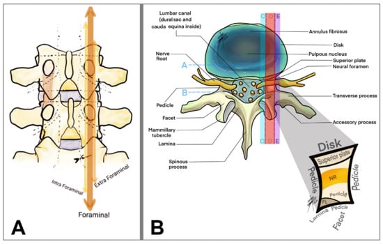 Drawing of a coronal (A) and axial (B) view of the lumbar spine focused on the lumbar foraminal space and its anatomical division (arrows in (A) and colorful stripes in (B)): A, anulus; B, dural sac; C, intraforaminal; D, foraminal; E, extraforaminal; NR, nerve root.