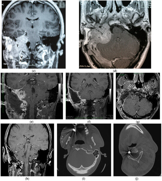 (Case 6) (a,b) Right-sided tympanojugular PGL (C4Di2Vi). (c) Coronal Gd-enhanced T1-weighted magnetic resonance imaging (MRI) shows a large residual tumor extending to the intradural space involving the vertebral artery. (d) Axial Gd-enhanced T1-weighted MRI shows a large residual tumor extending to the intradural space, involving transverse sinus ipsilaterally up to the torcula. (e) Coronal Gd-enhanced T1-weighted MRI after first-stage tumor removal. Note the residual tumor: T1 is in the cerebellopontine angle, and T2 is in the foramen magnum. (f) Coronal Gd-enhanced T1-weighted MRI after second-stage tumor removal, which shows a small residual tumor at the foramen magnum. (g,h) Axial and coronal Gd-enhanced T1-weighted MRI after third-stage tumor removal, which revealed total tumor removal at the level of the foramen magnum. (i,j) Axial CT scan after the third stage shows a coil at the internal carotid and vertebral arteries that are used for artery occlusion.