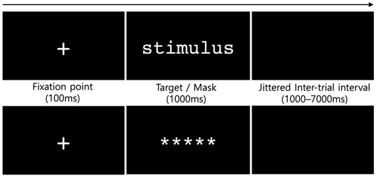 All stimuli were presented in white font (Courier New, size 28) on a black background, arranged in a pseudo-random order. The duration of the jittered intervals and the sequence of target stimuli were optimized using optseq2 software [64], and the presentation was controlled with the E-prime 2.0 Professional program (Psychology Software Tools, Inc., Sharpsburg, PA, USA). During the experimental session, stimuli were presented in 4 blocks, each consisting of 60 trials, with a one-minute break between blocks. Prior to the experimental session, the participants completed 30 practice trials. These included 5 baseline masks, 10 words, and 10 pseudowords not part of the experiment session. All participants achieved an accuracy rate above 80% in the practice session, ensuring their understanding of the procedure.