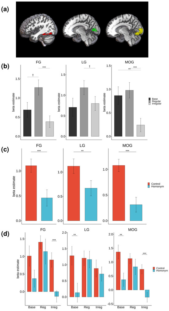 (a) The whole-brain activation map of the fusiform gyrus (FG), lingual gyrus (LG), and middle occipital gyrus (MOG). The highlighted regions indicate FG (red), LG (blue), and MOG (yellow). (b) Post-hoc analysis results of the main effect of morphology. (c) Post-hoc analysis results on the main effect of semantic ambiguity. (d) Post-hoc analysis results on the two-way interaction. Note. *** p < 0.001, ** p < 0.01, † p < 0.1.