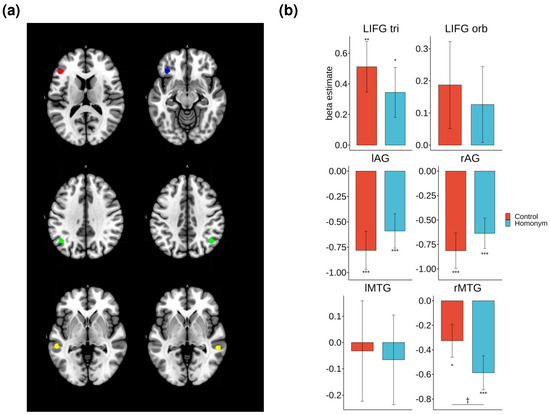 ROI analysis results illustrating the significant effect of ambiguity. (a) The corresponding regions highlighted in red (SMG), blue (left MOG), and yellow (right MTG). (b) The beta estimates for each ambiguity condition and statistical comparisons between control and homonymous words. Note. *** p < 0.001, ** p < 0.01, * p < 0.05, † p < 0.1.
