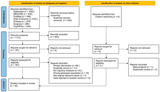 In total, 1958 articles were identified in the systematic literature search (MEDLINE: 352; PubMed: 398; Web of Science: 433; Embase: 279; Scopus: 266; PsycINFO: 224; other sources: 6). After removing duplicate articles, 1113 articles were screened based on their titles and abstracts, resulting in the exclusion of 932 articles. Following a full-text assessment, 163 records were further excluded due to reasons such as wrong interventions (n = 89), duplicate records (n = 11), lack of cognitive measures (n = 32), wrong participant population (n = 16), not being original research reports (n = 7), and data being reported in another record (n = 6). Two studies were included in this research after excluding meta-analysis (n = 1) and systematic reviews (n = 3) from the citation searching. Ultimately, 22 articles were deemed eligible for the systematic review. The literature search process is illustrated in Figure 1.