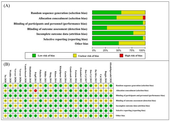 Quality and risk-of-bias assessment. Risk-of-bias graph (A): review authors’ judgments about each risk-of-bias item presented as percentages across all included studies; and risk-of-bias summary (B): review authors’ judgments about each risk-of-bias item for each included study (red, green and yellow circles indicate "high", "low" and "unclear" risk of bias, respectively).