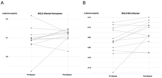 Graphical representation of BOLD-CVR values of the symptomatic (affected); (A) hemisphere and MCA. (B) territory before and after STA-MCA bypass.