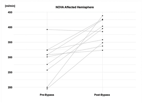Comparing hemispheric pre-bypass and post-bypass volume flow-rate values, a significant improvement after surgical revascularization is noted in the VFRs of the affected hemisphere (affected hemisphere preOP vs. postOP (mL/min): 282.77 ± 89.70 vs. 383.70 ± 40.37; p < 0.003). This increase in volume flow rate is attributed to the bypass flow (qMRA-NOVA bypass VFR (mL/min): 86.70 ± 30.32) (Table 5). Figure 3 visually depicts the change in the volume flow rate of the affected hemisphere for each patient before and after the bypass. All but one patient exhibited an increase in the volume flow rate of the affected hemisphere after surgical revascularization. This patient also showed no improvement in the CVR values following revascularization but exhibited the most relevant affected-hemisphere CVR worsening, as shown in the individual data in Figure 2.