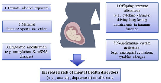 It has been reported that illicit drugs and other substances are capable of passing via the placenta, activation of the immune system, and disrupting the development of offspring by changing gene expression and/or causing epigenetic aberrations in various body organs, especially the brain tissue, and subsequently increasing the risk of mental disorders (Figure 3) [110,111].