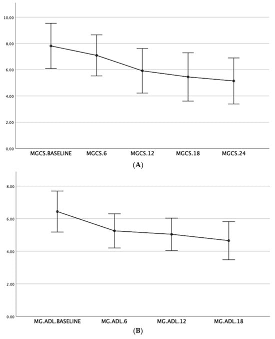 Illustrative graph of the trend improvement in the MGCS scale (A) and MGADL (B) at different time points (from baseline, 6, 12, 18, and 24 months).