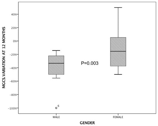 The ANOVA test revealed a significant correlation between the delta variations in MGCS scores at 12 months and sex. Specifically, this indicated that the change in MGCS scores over the 12-month period was significantly different between males and females (p = 0.003), with males responding better to MMF (Figure 3).