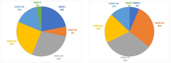 The distribution of MGFA classification among patients at the start of MMF (left) and at last follow-up (right).