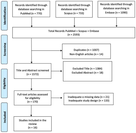 The search produced 2593 articles as results. Subsequently, 1007 articles were removed because they represented duplicates, 14 articles were excluded because they were written in a language other than English, and 1402 articles were removed based on the title and abstract screening. In addition, 154 articles were removed based on the screening of inappropriate study designs and untraceable articles. Sixteen research articles met the inclusion criteria. The screening process is summarized in Figure 1, and the studies included in this review are shown in Table 1.