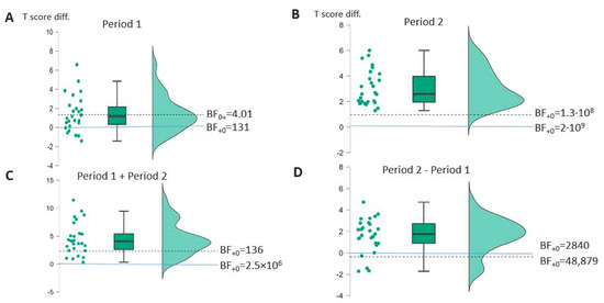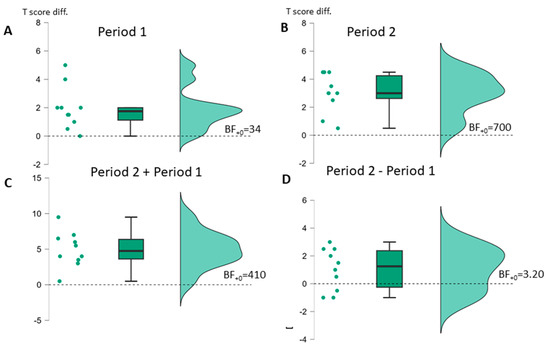 Raincloud plots of BIAS-R average percentage value T-score changes (A): Across period 1, (B): Across period 2, (C): Across periods 1 + 2, (D): Across period 2 vs. period 1; Bayes factor for one-sided t-test against no change (dashed line).