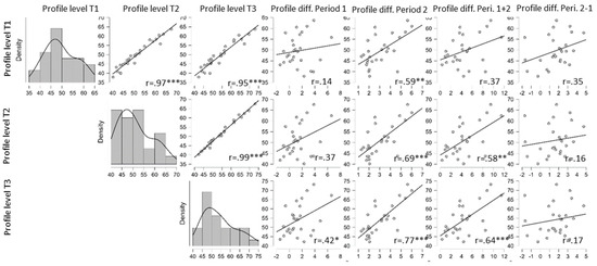 Correlations among level of and change in performance for the AAT profile level for the three assessments; * p < 0.05, ** p < 0.01, *** p < 0.001.