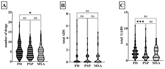 Anticholinergic burden in Parkinsonian syndromes. The violin plot shows the median and the quartiles of the number of drugs (A), total ADS (B), and total GABS (C) for PD, PSP, and MSA. * p < 0.05, *** p < 0.001, ns non-significant, Kruskal–Wallis test. GABS, German Anticholinergic Burden Scale; ADS, Anticholinergic Drug Scale; MSA, multiple system atrophy; PD, Parkinson’s disease; PSP, progressive supranuclear palsy.