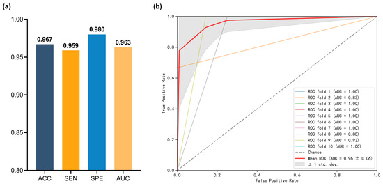 Classification performance in SZ vs. BD. (a) ACC, SEN, SPE, and AUC, (b) ROC curve.