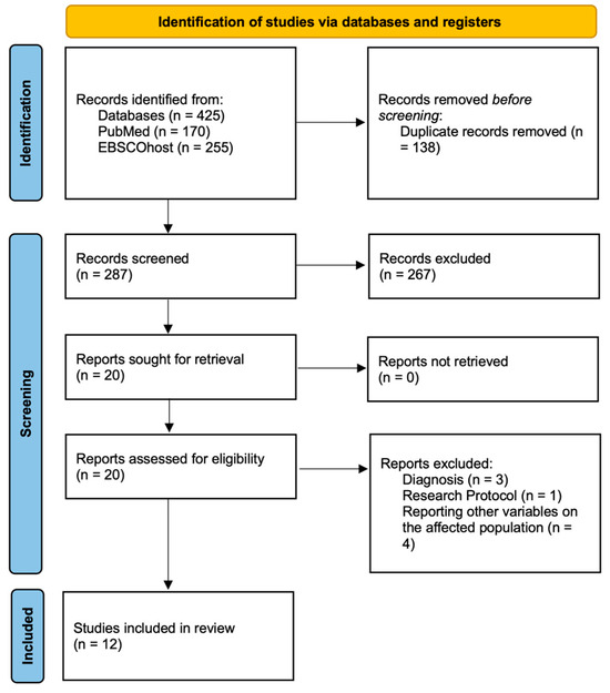 The search results and the study selection process are depicted in the flowchart below (Figure 1). The search string, once entered into the two databases, produced a total of 425 results (of which 170 on PubMed and 255 on EBSCOhost). Following removal of duplicates (N = 138), 287 articles were screened. Following reading of the title and abstract 268 were excluded, leading to 20 studies. All studies were found; therefore, 20 trials were subjected to the final screening step by full text reading. A further 8 studies were excluded as they did not meet the eligibility criteria outlined above. Three studies were excluded because participants’ primary diagnosis was not MDD [52,53,54], one because it was not a clinical trial but a research protocol [40], and four because they reported other variables of no interest for the present review on the population affected [55,56,57,58]. Overall, the studies included in this review were 12 [30,59,60,61,62,63,64,65,66,67,68,69].