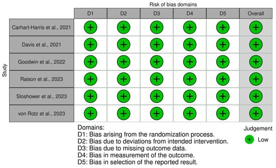 Using the RoB2 tool, all six randomized controlled studies were judged to have a low risk of bias in all five domains, resulting in an overall low risk of bias (Figure 2).
