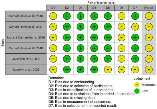 On the other hand, the six non-randomized or non-controlled trials, assessed using the ROBINS-I tool, emerged with a global moderate-level risk of bias (Figure 3). The first and sixth domains (bias due to confounding, bias in measurement of outcomes) resulted moderately in all five studies included. Moreover, two studies showed a moderate level of bias in the seventh domain (bias in selection of the reported result), and one study was evaluated with a moderate level of risk of bias in the fifth domain (bias due to missing data).
