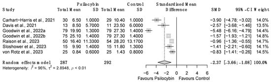The psilocybin effect on patients’ depressive symptoms severity was also compared to the consequences sorted by ‘inactive’ interventions (e.g., placebo, niacin), where control groups were included in the research designs. Random-effect meta-analysis showed that psilocybin significantly reduces subjects’ depressive symptoms severity compared to control (z = −3.60, p < 0.001, d = −2.37, 95% CI [−3.66; −1.08]; Figure 6). Subgroup analyses were not conducted in this case due to the low number of studies employing a control group/condition (k = 7). Overall heterogeneity resulting from effect size variability and sampling error was high (I2 = 96.3%, 95% CI [94.3%; 97.6%]; H = 5.23, 95% CI [4.20; 6.52], τ2 = 2.89, 95% CI [1.13; 14.39]), as well as the heterogeneity in the effect size distribution (Q(6) = 164.37, p < 0.001).