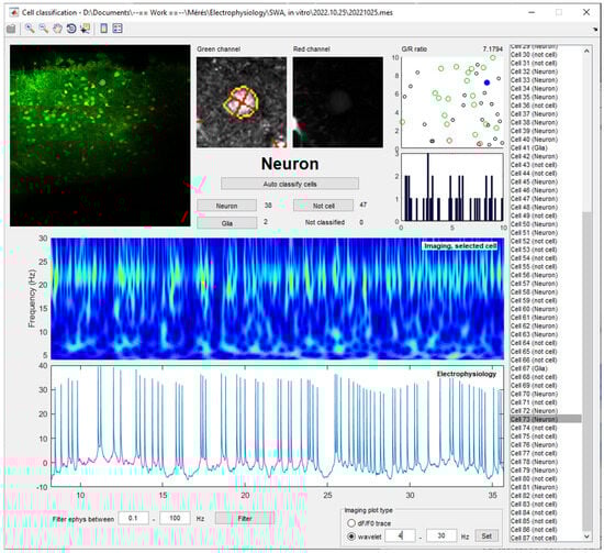 A GUI for classification and spectral analysis of Ca2+ imaging data of individual cells. High Ca2+ imaging sampling rate (68 Hz) together with the unique spectral analysis capabilities of the FluoAnalysis toolbox enables the identification of a high-frequency imaging signal that corresponds to the firing rate of a cortical pyramidal cell as measured by patch clamp electrophysiology. All imaged cells (listed on the right) can be individually investigated. Automatic classification of the cells as neurons or astrocytes, based on the ratio of green and red channel intensities in the ROIs, can be manually overridden. Wavelet analysis can be easily applied at different frequency bands.