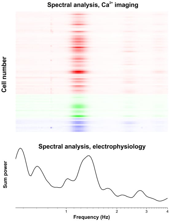 Furthermore, the available analysis tools primarily focus on detecting single events (peaks) in calcium signals [,], paying much less attention to revealing the spectral components of the oscillating calcium signals that may provide deeper insights into the network dynamics of large-scale neuronal and astrocytic ensembles and decipher the underlying biological processes. Notably, the spectral analysis of electrophysiological signals has previously led to ground-breaking findings about neuronal oscillations and their roles in various vital physiological processes []. Despite the success of the spectral analysis of electrophysiological recordings, however, the current analysis tools lack robust functionality for decomposing and analyzing different frequency components in imaging data, which may be even more relevant when considering the high-frequency calcium fluctuations in thin astrocytic processes []. This limitation hampers our ability to fully interpret the complex dynamics of calcium signaling [].