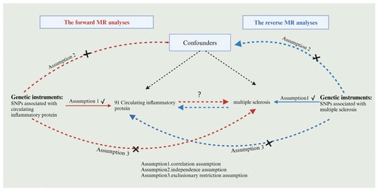 Using the two-sample MR study, this research was performed to examine the causal link between circulating inflammatory proteins and MS. Achieving valid results in MR analysis hinges on satisfying three key assumptions. Single nucleotide polymorphisms (SNPs) were used as instrumental variables (IVs) in this study, and it is vital for IVs acting as risk factors to meet three conditions, as illustrated in Figure 1. First, a reliable connection to the risk factor being evaluated must be established (correlation assumption). Second, it is essential to ensure independence from any recognized or unrecognized confounding variables (independence assumption). Third, only the risk factor should influence the outcome, while any other direct causal pathway will be excluded (exclusionary restriction assumption) []. Through the utilization of openly accessible data derived from extensive GWAS and consortia, ethical clearance was not a prerequisite for the conduct of this study. Visual summary of the analysis is shown in Figure 2.