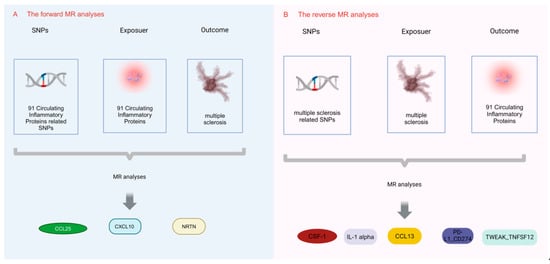 Visual summary of the analysis. The MR analysis unveils the relationships between circulating inflammatory proteins and MS. (A) The forward MR analyses; (B) the reverse MR analyses.