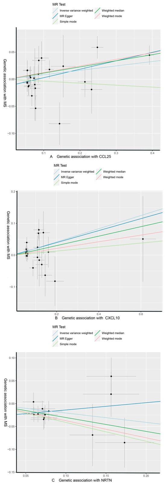 CCL25, CXCL10, and NRTN of MS with scatter plots, respectively. (A) MS as the outcome, with CCL25 as the exposure; (B) MS as the outcome, with CXCL10 as the exposure; (C) MS as the outcome, with NRTN as the exposure.