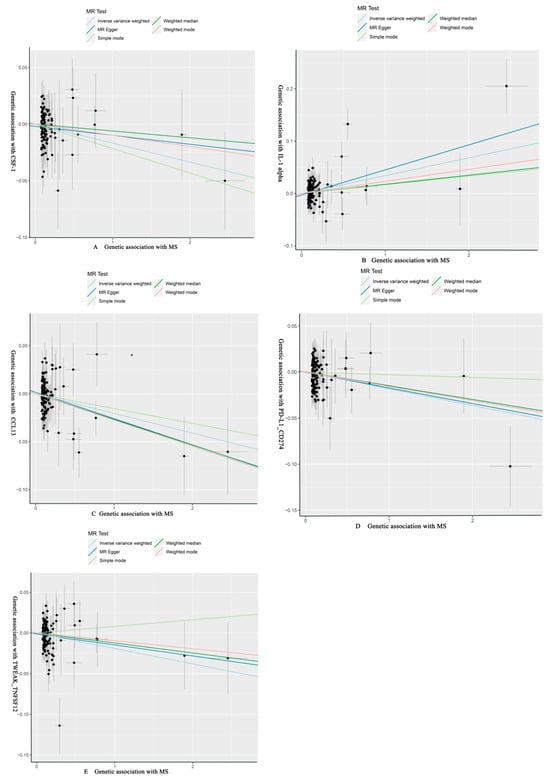 MS of CSF-1, IL-1 alpha, CCL13, PD-L1_CD274, TWEAK_TNFSF12 with scatter plots, respectively. (A) CSF-1 as the outcome, with MS as the exposure; (B) IL-1 alpha as the outcome, with MS as the exposure; (C) CCL13 as the outcome, with MS as the exposure; (D) PD-L1_CD274 as the outcome, with MS as the exposure; (E) TWEAK_TNFSF12 as the outcome, with MS as the exposure.
