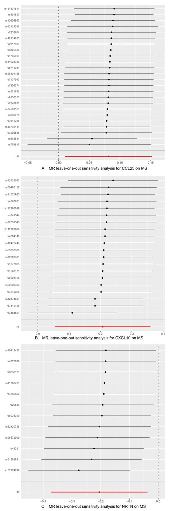 Use of the IVW method to display the results of leave-one-out analyses and assess the impact of individual SNPs on the overall MR results by excluding each SNP in turn. (A) MS as the outcome, with CCL25 as the exposure; (B) MS as the outcome, with CXCL10 as the exposure; (C) MS as the outcome, with NRTN as the exposure.